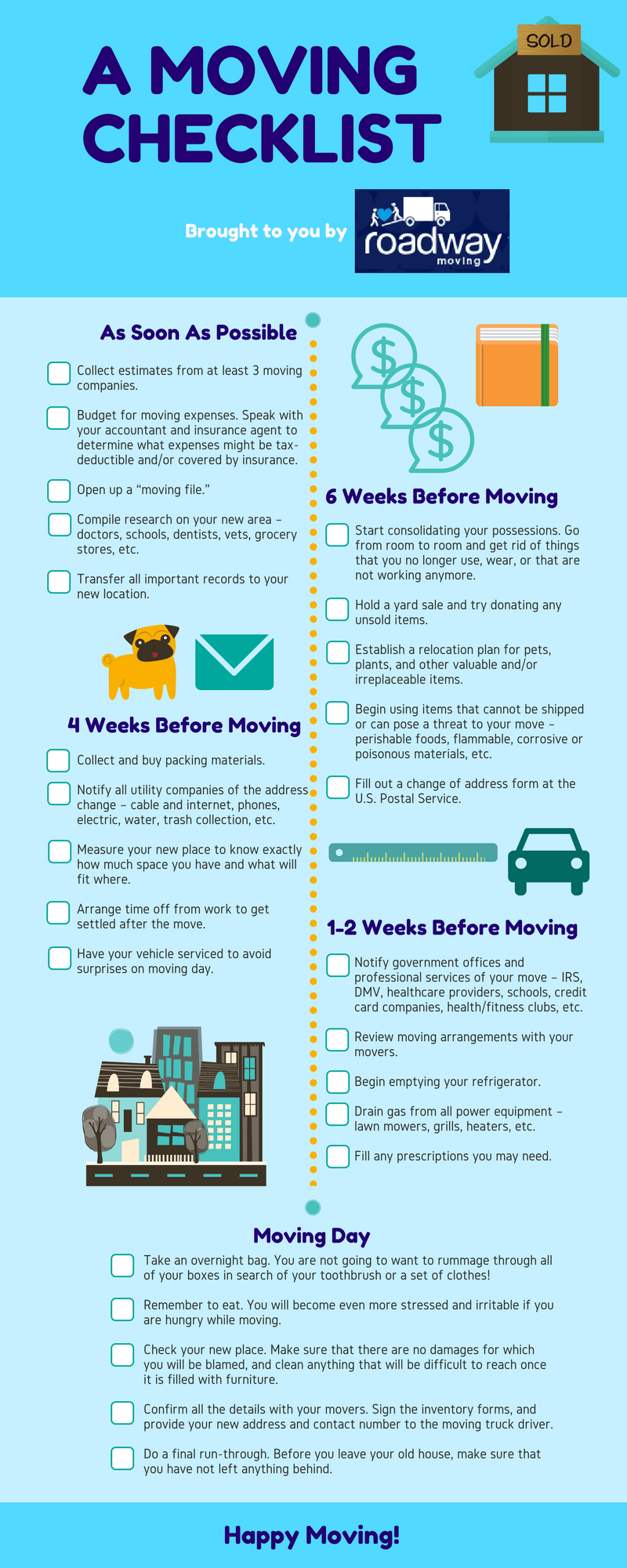 Moving to a new house or apartment can be fun and exciting, but there is also a lot to remember throughout the process. Learning how to plan, purge, and pack is only part of the problem: Knowing the perfect time for each part of the move can overwhelm even the most seasoned home relocation veteran. That is why we at Roadway Moving have created “The Ultimate Moving Checklist” to serve as your moving guide.